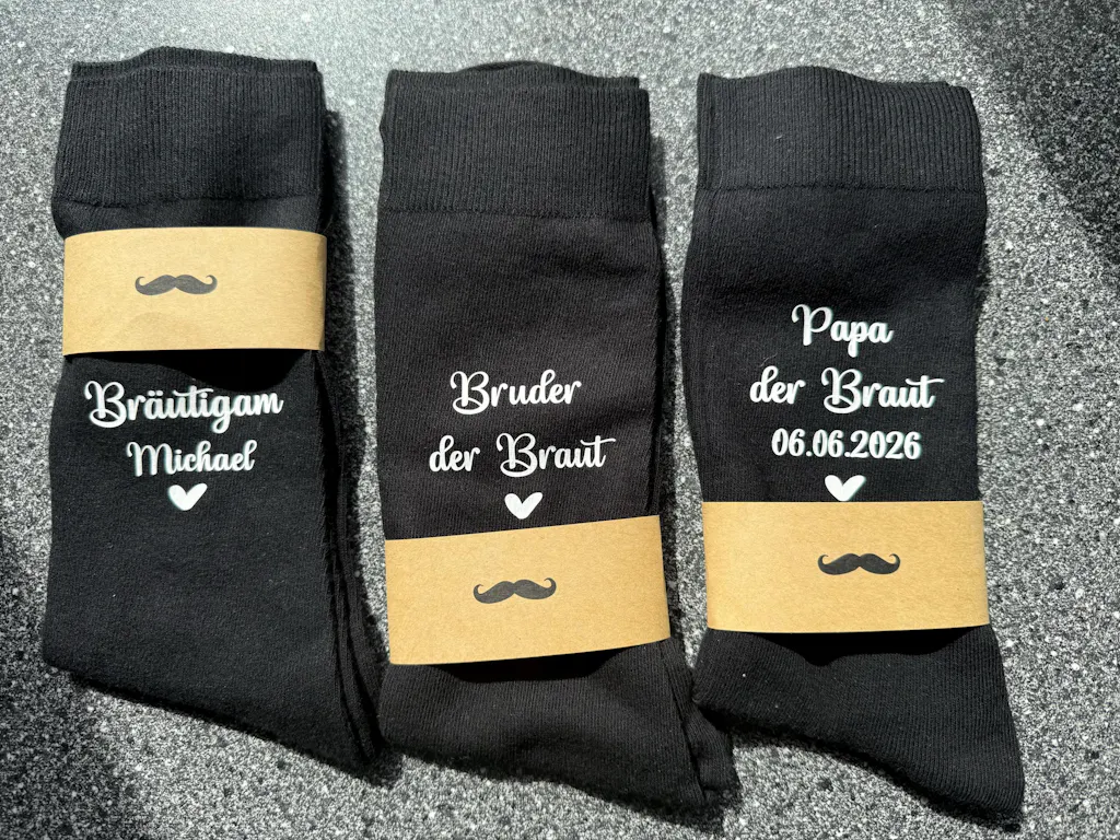 Von der Schürze oder Jute-Tasche, bis hin zum JGA-Shirt oder unseren Hochzeitssocken, auch im Textildruck sind uns so gut wie keine Grenzen gesetzt. Wir bedrucken unsere Textilien mit hochwertiger Flexfolie, die eine hohe Waschbarkeit aufweist und auch für Arbeitskleidung geeignet ist.