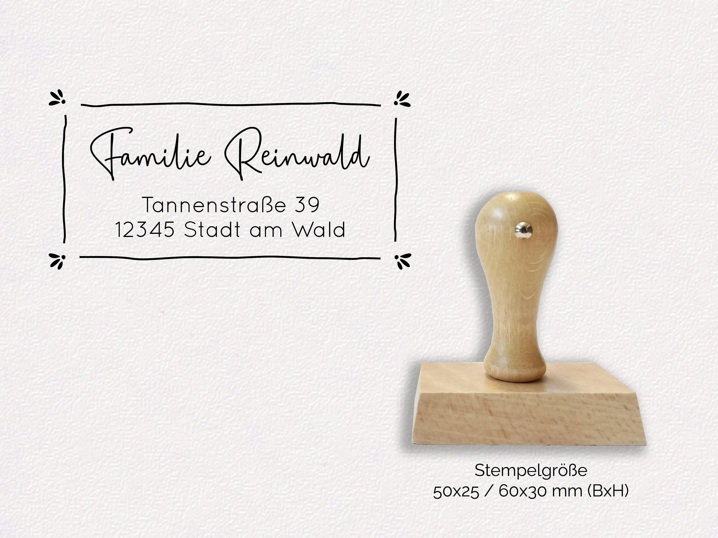 🚚 Lieferumfang nach Set Auswahl, einen "Adressstempel - Reinwald | Zierrahmen" - Rechteckig 50x25 mm / 60x30 mm Holzstempel, ohne Deko.