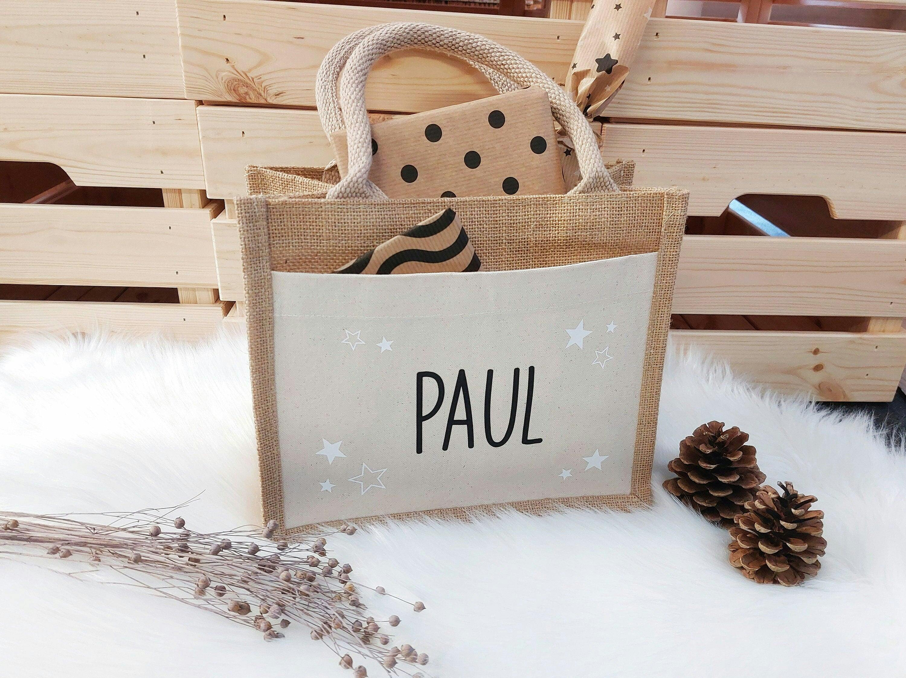 Eine Jute-Tasche* mit 📛 Wunschnamen, Design nach Wahl (vgl. Bild Design 1-4), Lieferung ohne Inhalt/Deko