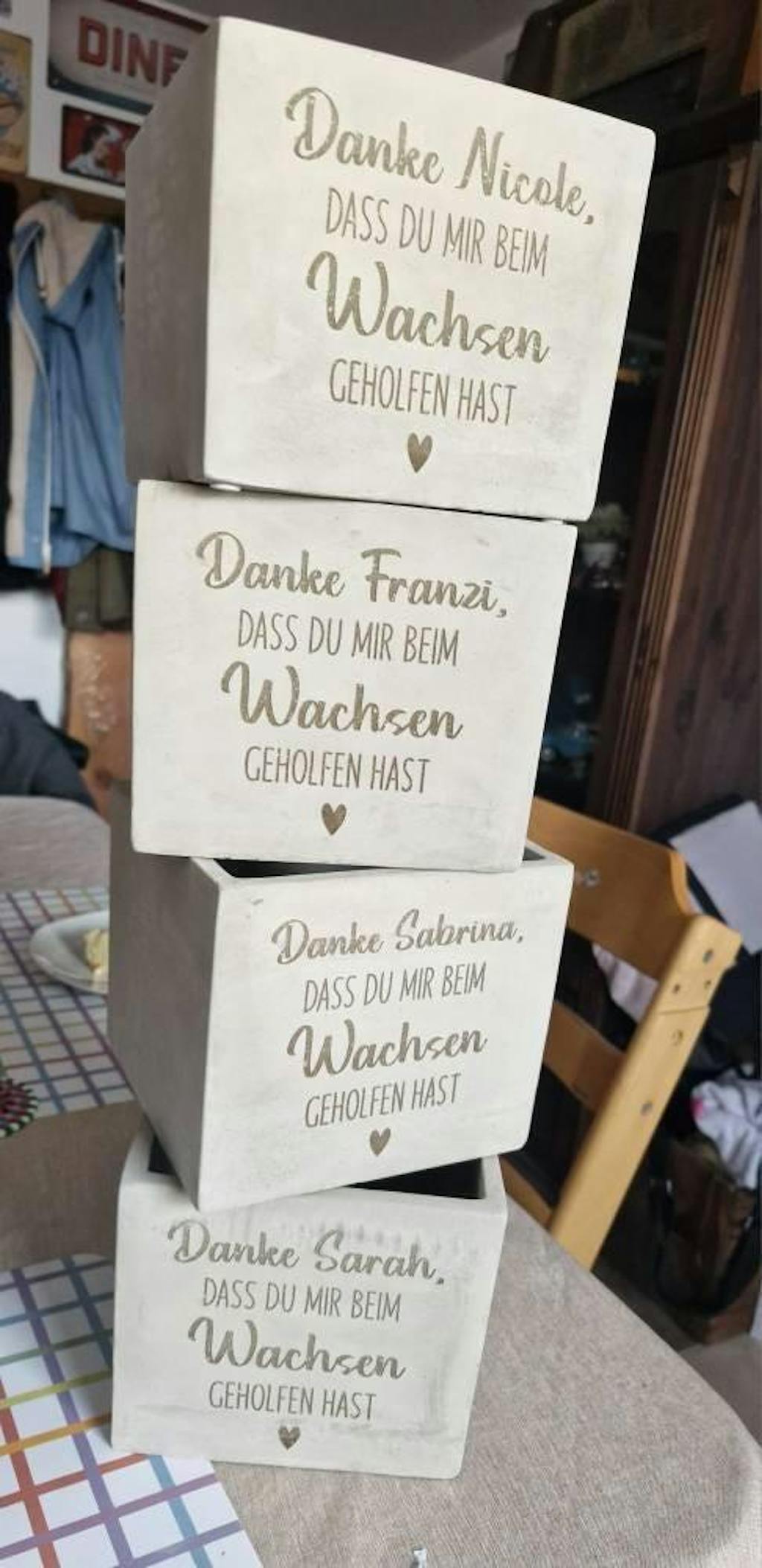 Du kannst zwischen verschiedenen Topfgrößen wählen und eine von vier modernen Schriftarten aussuchen – so findet jede:r genau das Design, das zum Anlass oder zur beschenkten Person passt. Die Personalisierung erfolgt auf der Vorderseite des Blumentopfes.