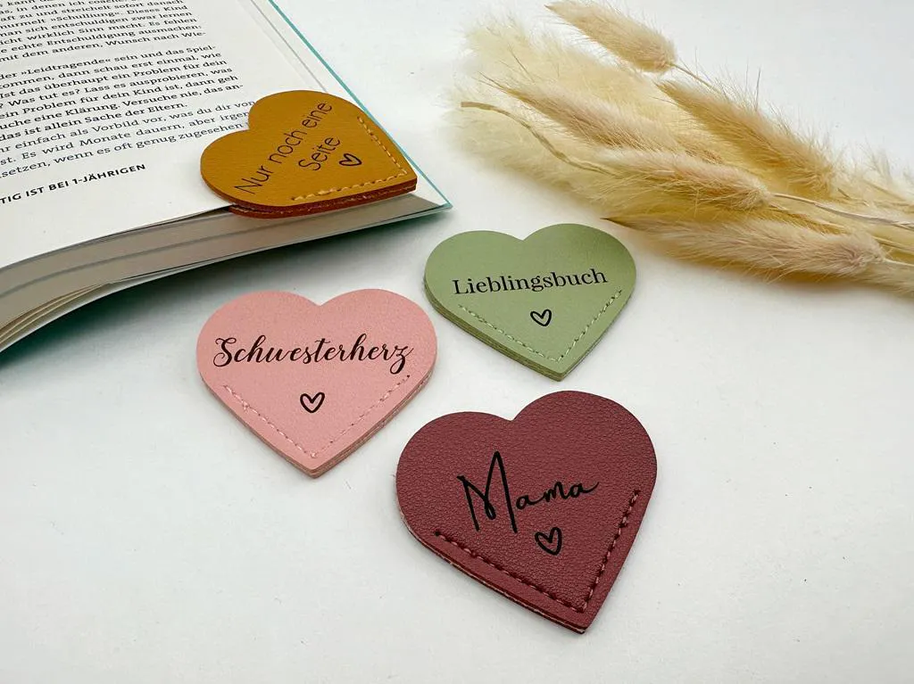 🚚 Lieferumfang: Ein personalisiertes Herz-Lesezeichen (Farbe und Schriftart nach Wahl) aus Kunstleder