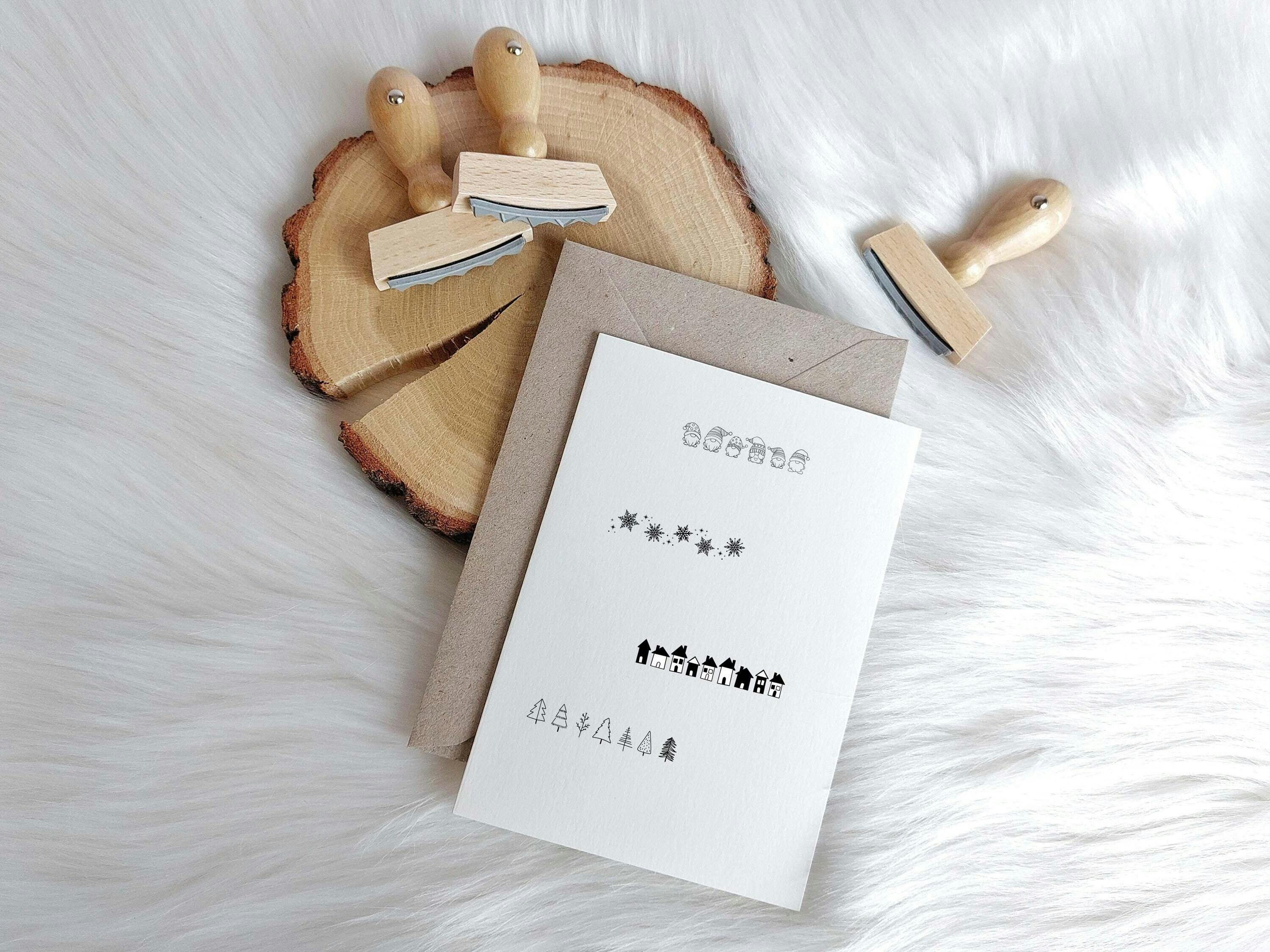 Weihnachtliche Stempel Motive: Winterdorf, Schneeflocken Kristalle, Wichtel, Bäumchen | Holzstempel 10x50mm, 20x70mm | Stempel zum Gestalten