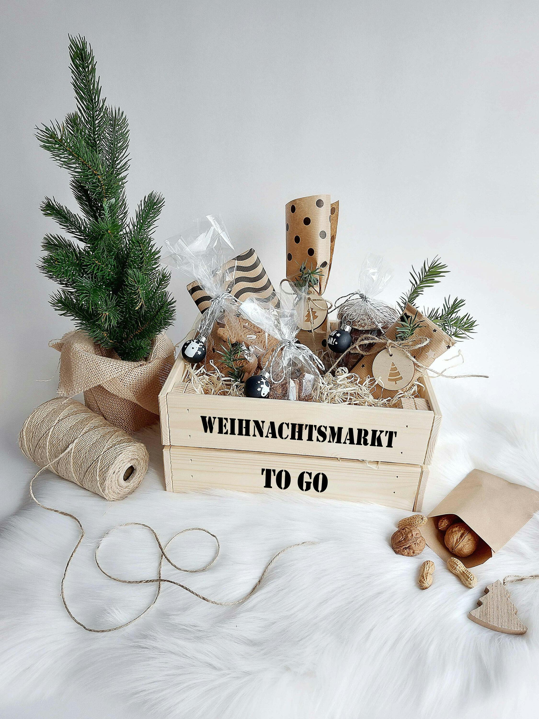 Weihnachtsmarkt "to go" mit Name, personalisierte Aufkleber oder Holz Geschenkkiste DIY zum selbst Befüllen - Advent Winterzauber Holzkiste
